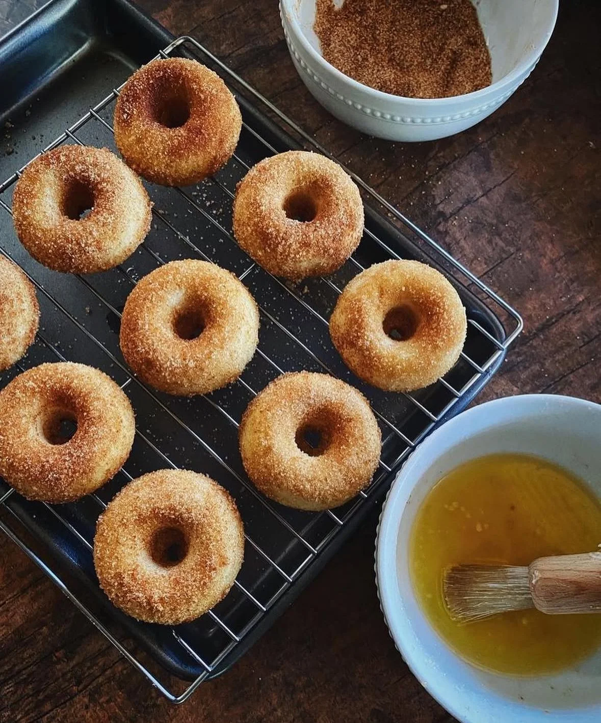 Add Topping: While warm, brush each donut lightly with melted butter, then toss in the cinnamon sugar mixture until well coated.